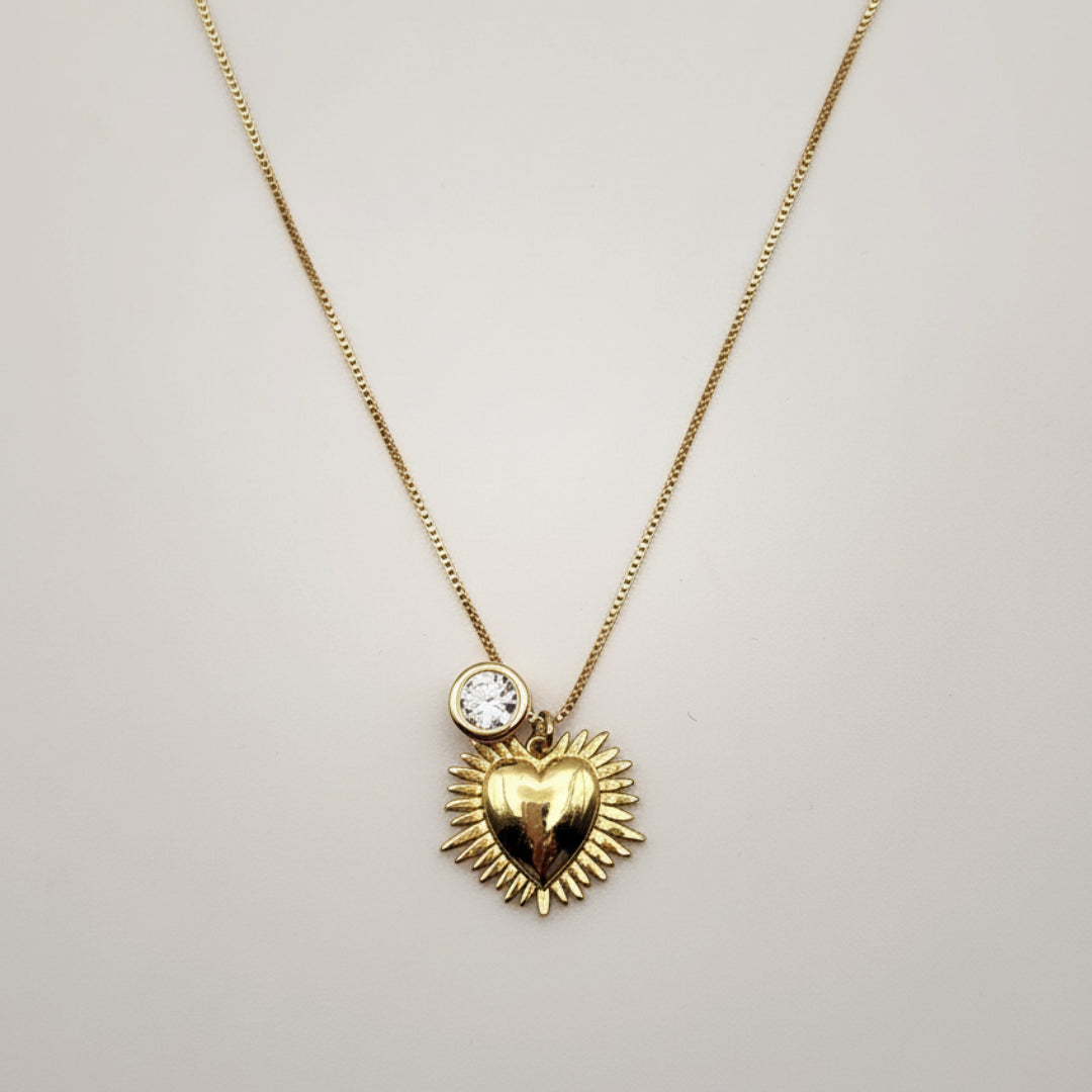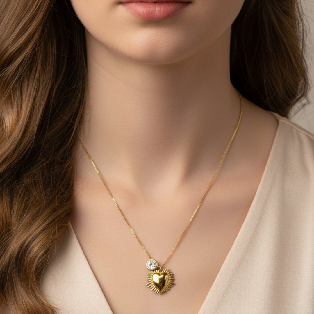 Cuando buscas un collar que tenga presencia, significado y brillo sin ser exagerado, esta pieza se convierte en ese detalle perfecto. El corazón dorado con bordes tipo rayos simboliza la energía del amor que irradia desde tu interior, mientras el punto de luz aporta un destello sutil que eleva cualquier look.