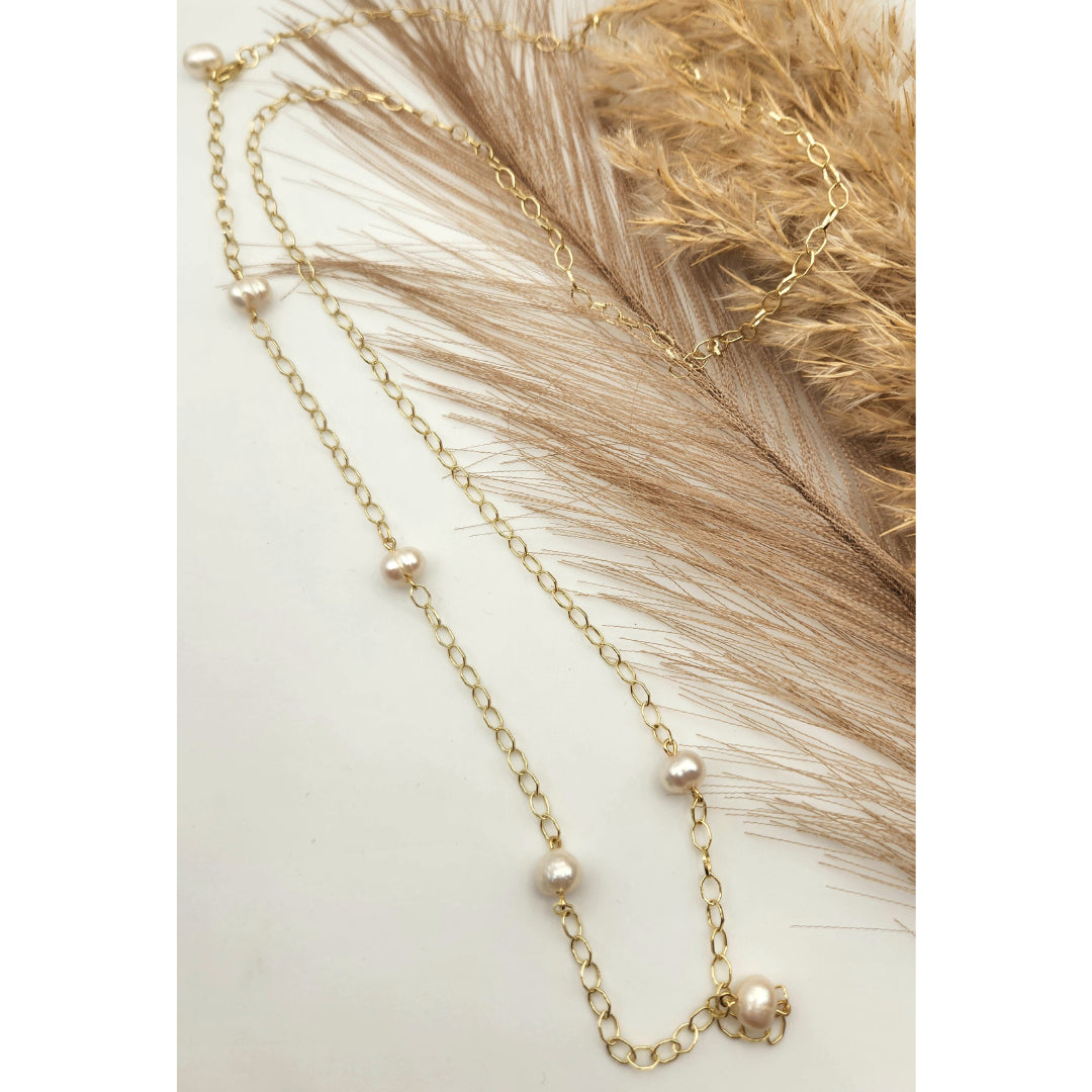 Materiales: Cadena dorada con perlas decorativas.