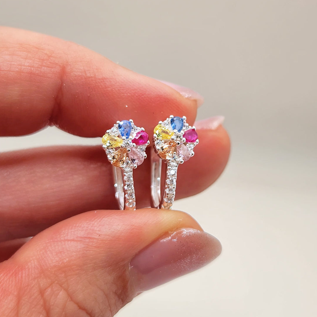 Si buscas aros que aporten color, luz y personalidad sin perder elegancia, estas argollas son el equilibrio perfecto. La flor formada por circones de colores ilumina tu rostro y transmite alegría, frescura y creatividad, ideal para darle vida a cualquier look sin depender de tendencias pasajeras.